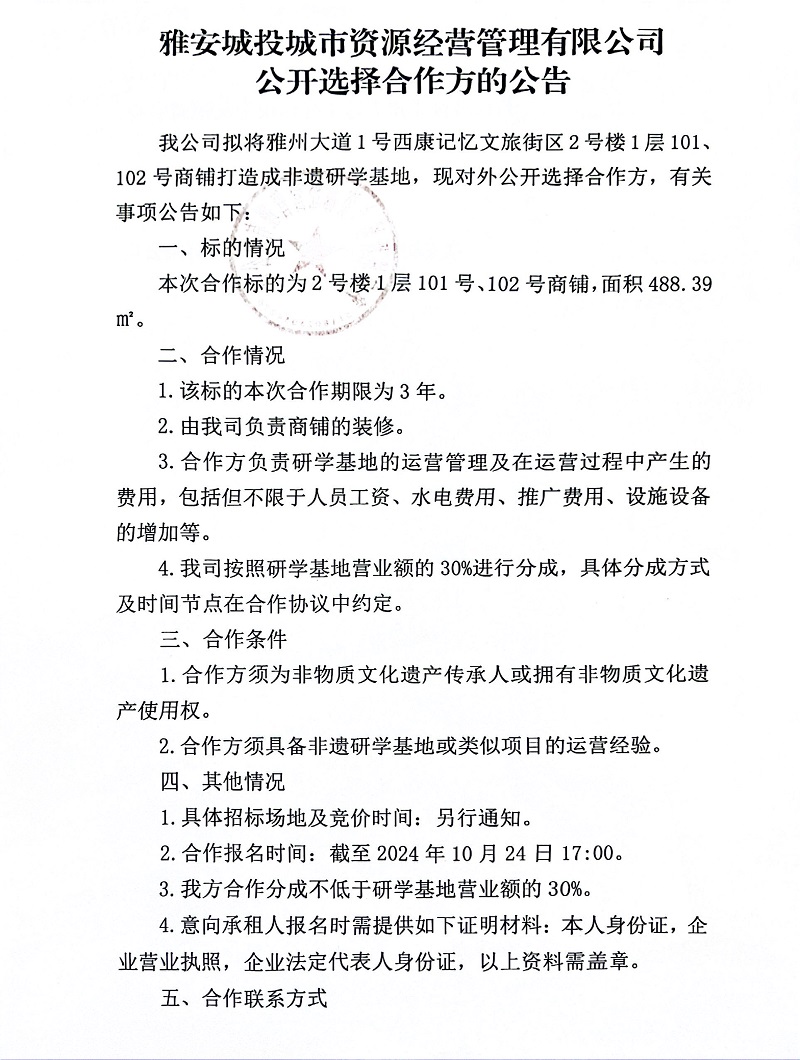 雅安城投城市資源經(jīng)營(yíng)管理有限公司公開選擇合作方的公告