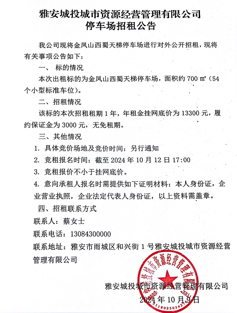 雅安城投城市資源經(jīng)營管理有限公司關于金鳳山西蜀天梯停車場招租的公告