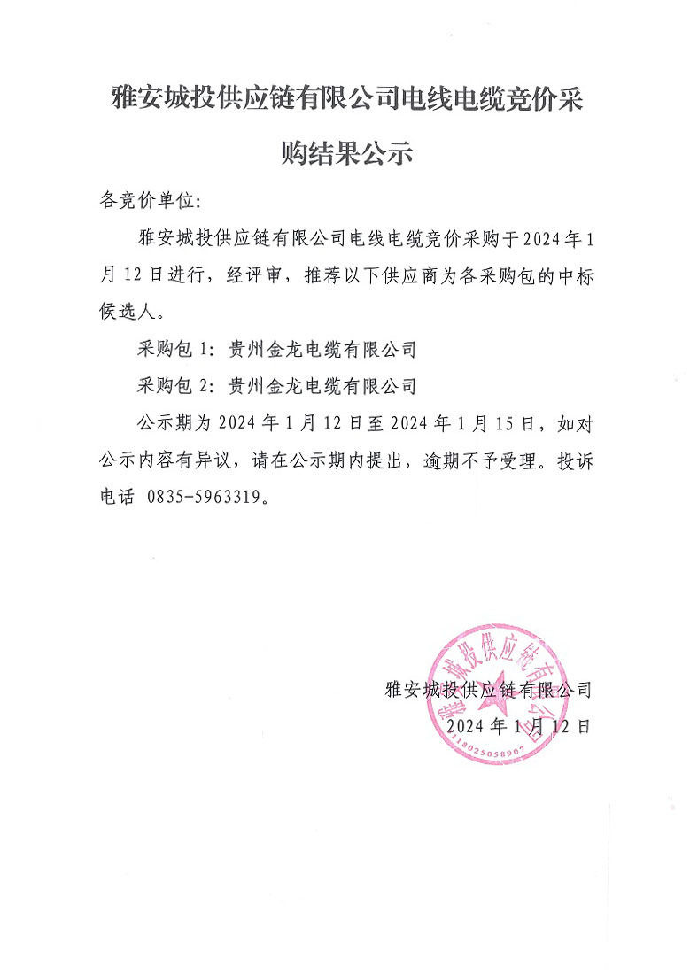 雅安城投供應(yīng)鏈有限公司電線電纜競價(jià)采購結(jié)果公示