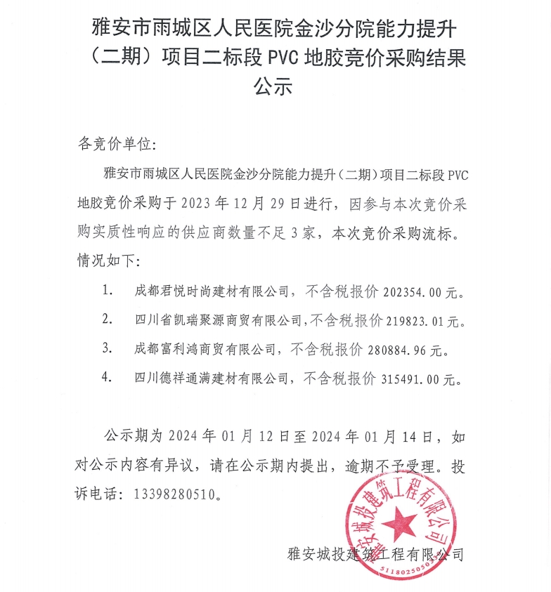 雅安市雨城區(qū)人民醫(yī)院金沙分院能力提升(二期)項(xiàng)目二標(biāo)段PVC地膠競(jìng)價(jià)采購(gòu)結(jié)果公示