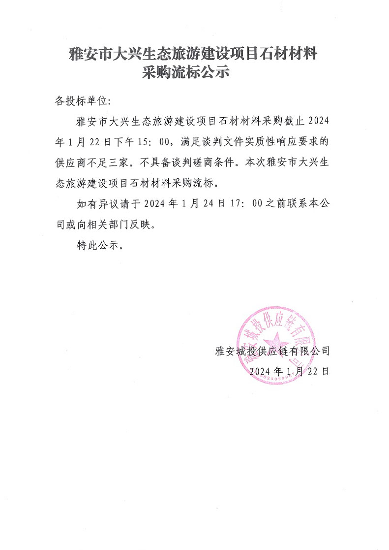 雅安市大興生態(tài)旅游建設(shè)項(xiàng)目石材材料采購流標(biāo)公示