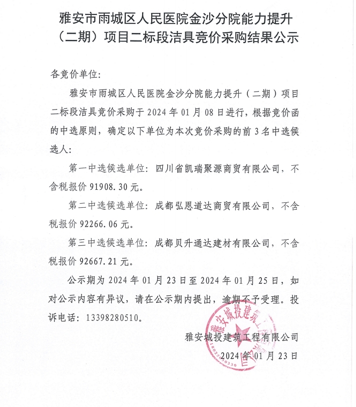 雅安市雨城區(qū)人民醫(yī)院金沙分院能力提升(二期)項目二標(biāo)段潔具競價采購結(jié)果公示