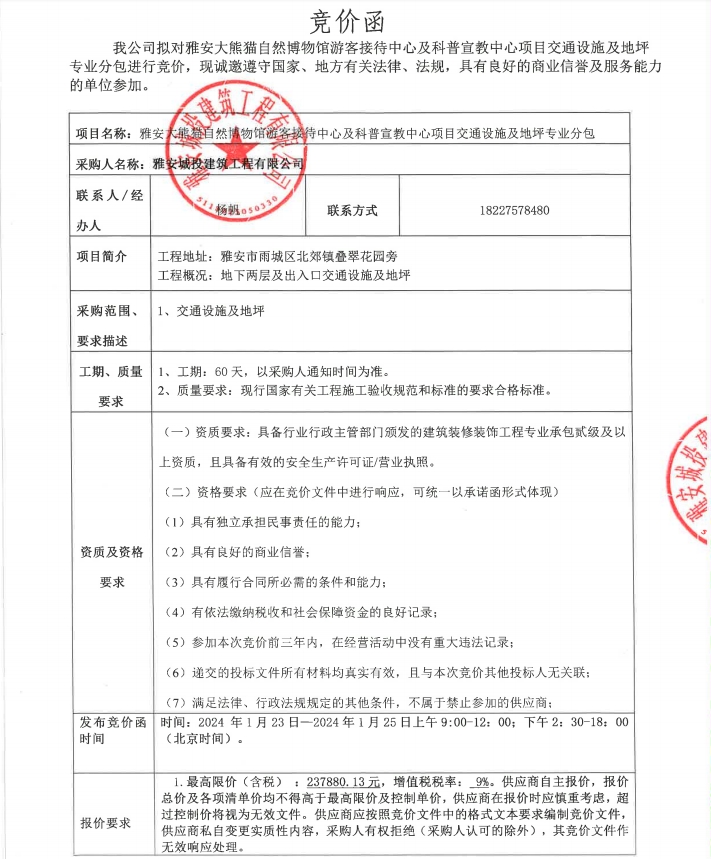 雅安大熊貓自然博物館游客接待中心及科普宣教中心項目交通設(shè)施及地坪專業(yè)分包競價公告