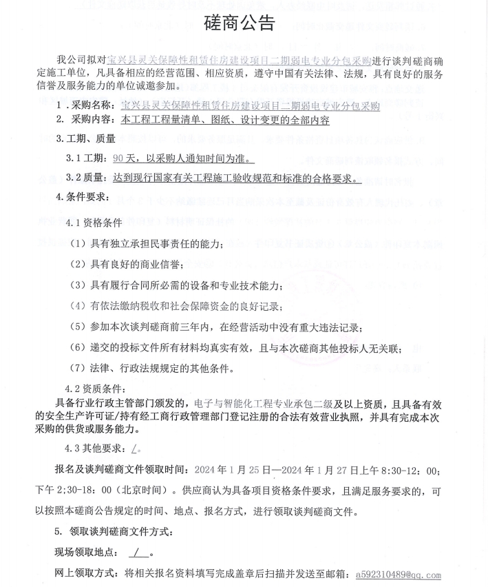 寶興縣靈關(guān)鎮(zhèn)保障性住房建設(shè)項(xiàng)目二期弱電專業(yè)分包采購磋商公告