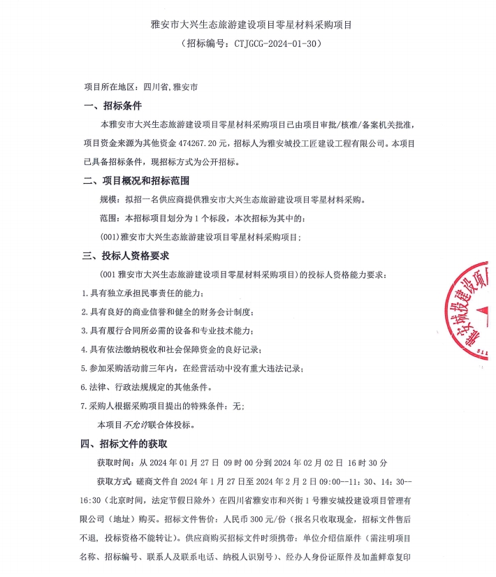 雅安市大興生態(tài)旅游建設(shè)項目零星材料采購項目公告