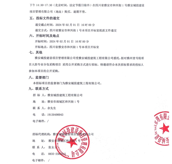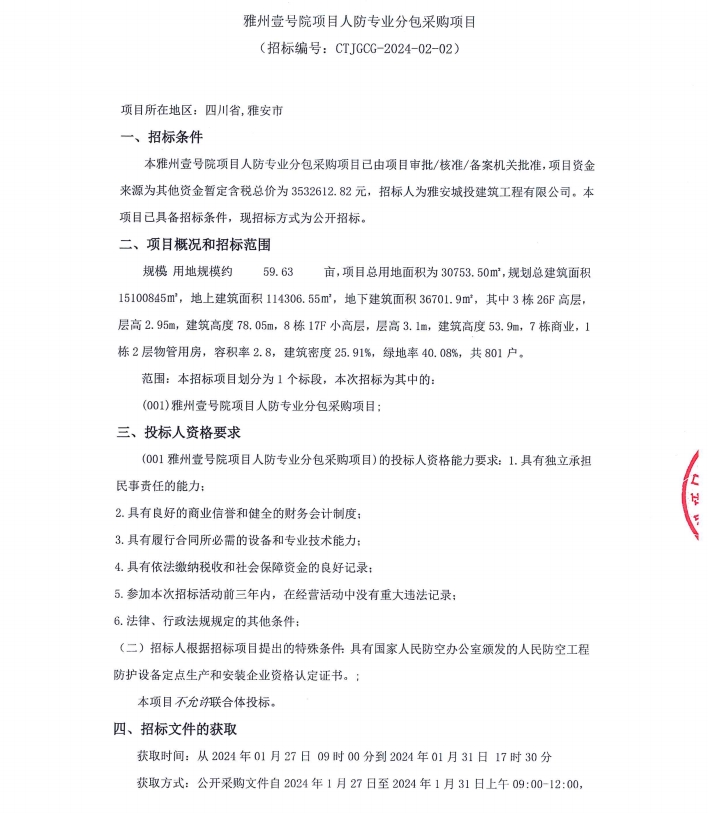 雅州壹號院項目人防專業(yè)分包采購項目公告