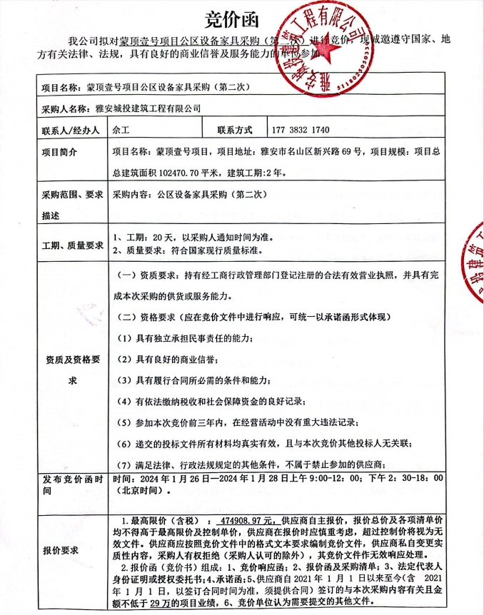 蒙頂壹號項(xiàng)目公區(qū)設(shè)備家具采購(第二次)競價(jià)公告