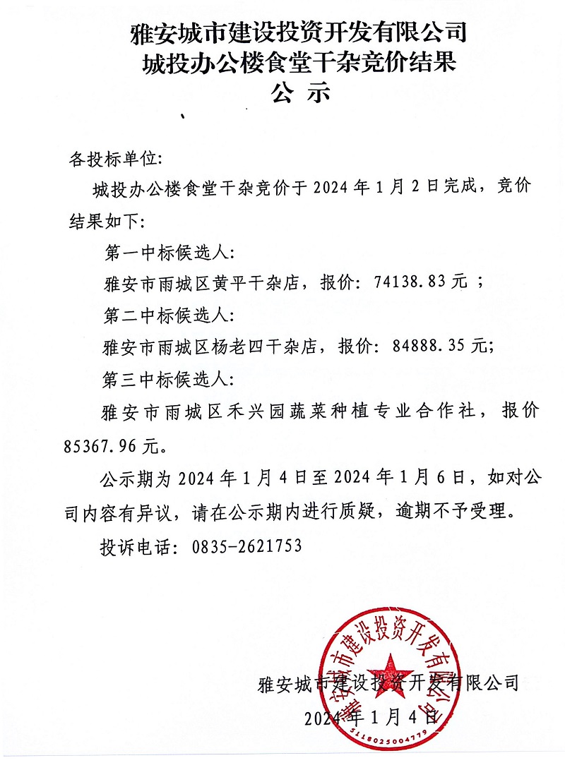雅安城市建設(shè)投資開發(fā)有限公司城投辦公樓食堂干雜競價(jià)結(jié)果公示