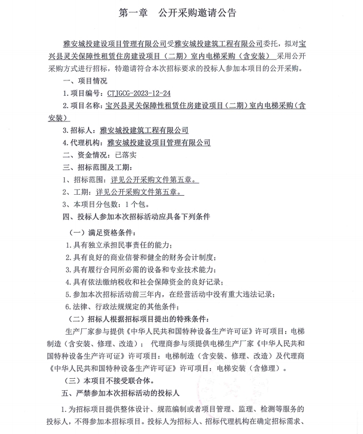 寶興縣靈關保障性租賃住房建設項目(二期)室內(nèi)電梯采購(含安裝)公開采購邀請公告