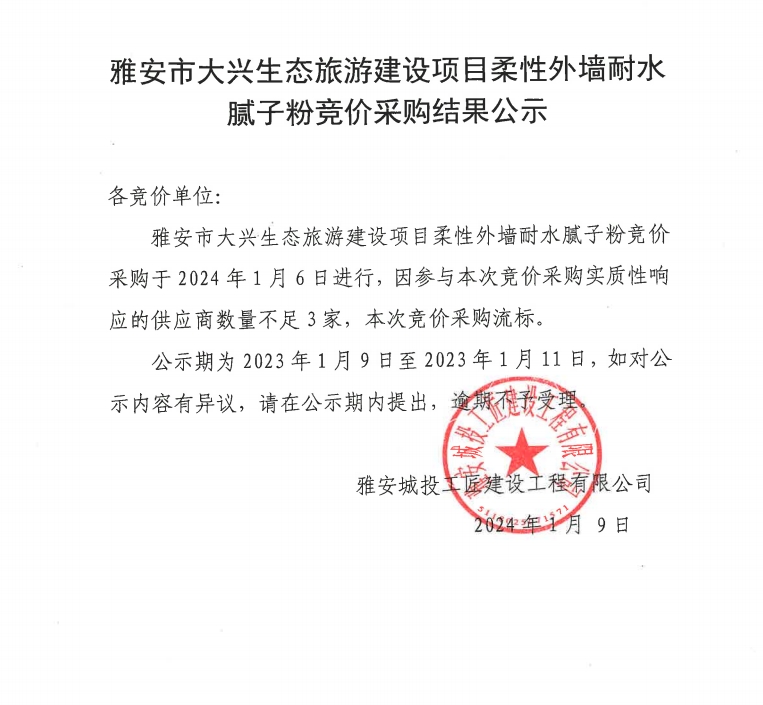 雅安市大興生態(tài)旅游建設(shè)項(xiàng)目柔性外墻耐水膩?zhàn)臃鄄牧细?jìng)價(jià)采購結(jié)果公示