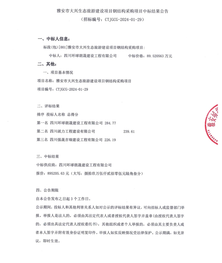 雅安市大興生態(tài)旅游建設(shè)項目結(jié)構(gòu)采購項目中標結(jié)果公告