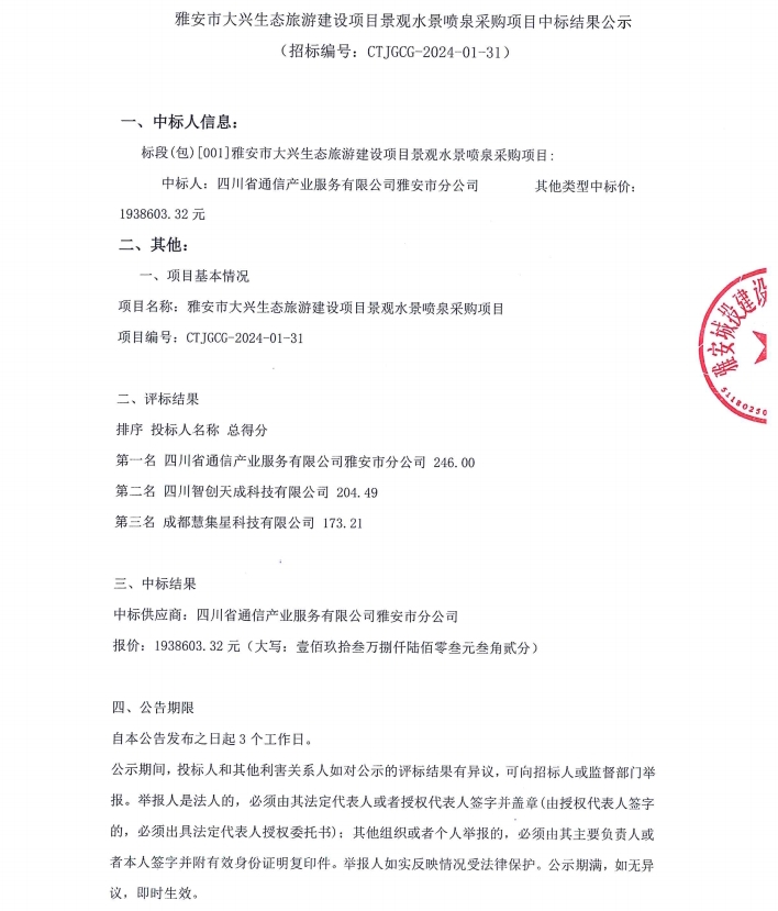 雅安市大興生態(tài)旅游建設項目景觀水景噴泉采購項目中標結果公示