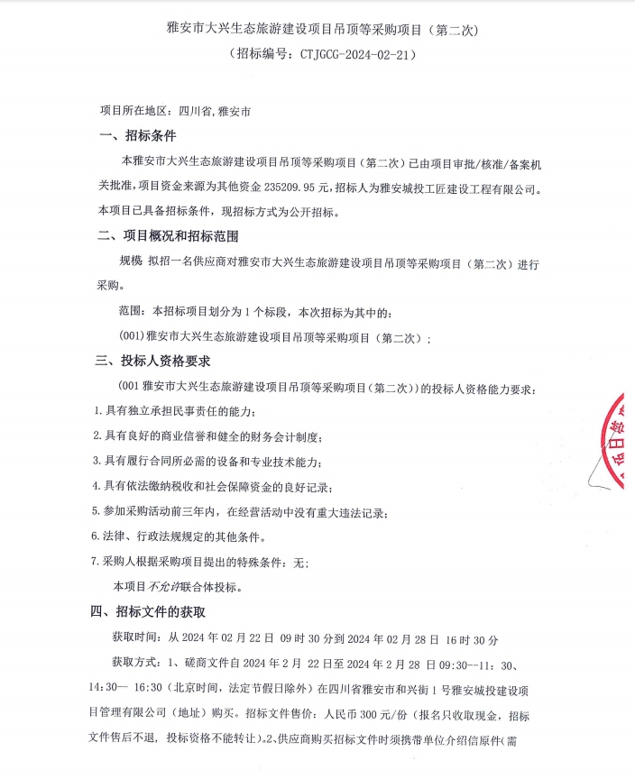 雅安市大興生態(tài)旅游建設(shè)項(xiàng)目吊頂?shù)炔少忢?xiàng)目(第二次)公告
