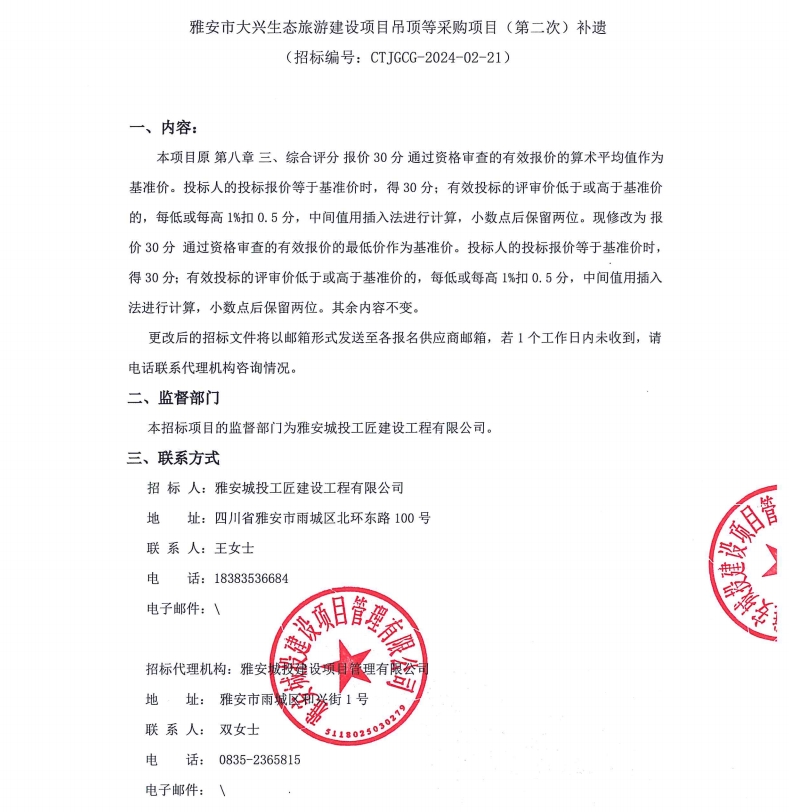 雅安市大興生態(tài)旅游建設(shè)項目吊頂?shù)炔少忢椖浚ǖ诙危┭a遺公告