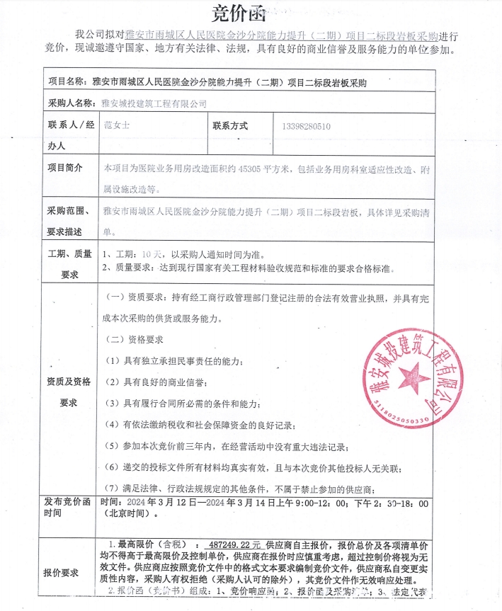 雅安市雨城區(qū)人民醫(yī)院金沙分院能力提升(二期)項(xiàng)目二標(biāo)段巖板采購(gòu)競(jìng)價(jià)公告