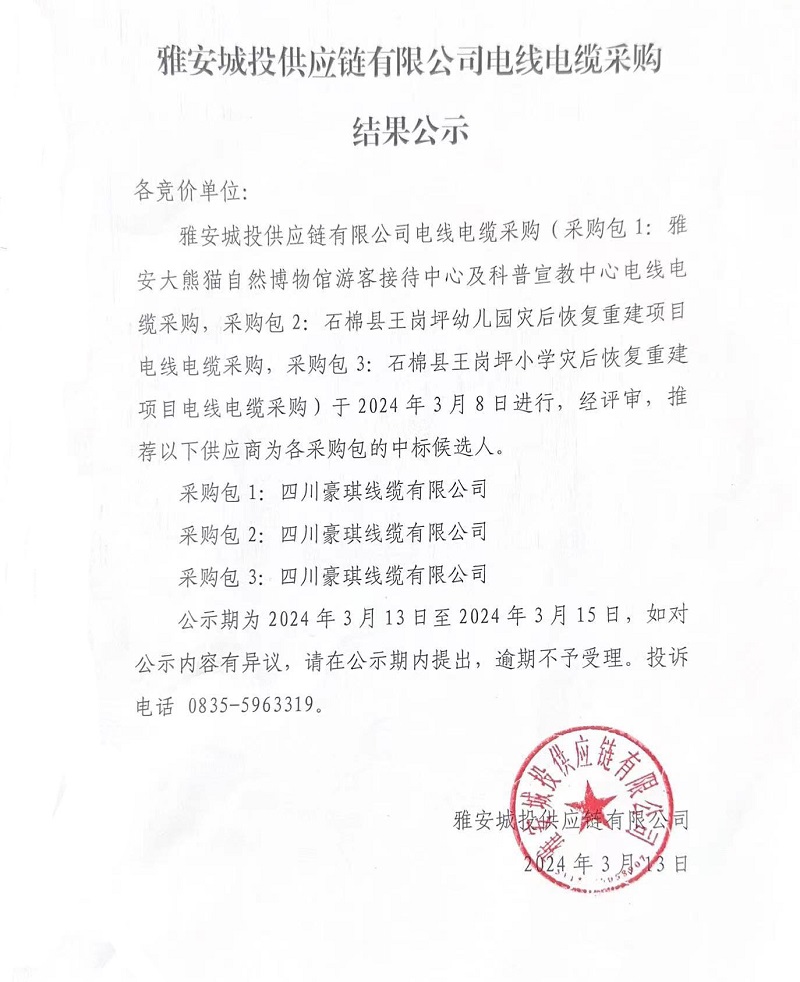 雅安城投供應(yīng)鏈有限公司電線電纜采購(gòu)結(jié)果公示