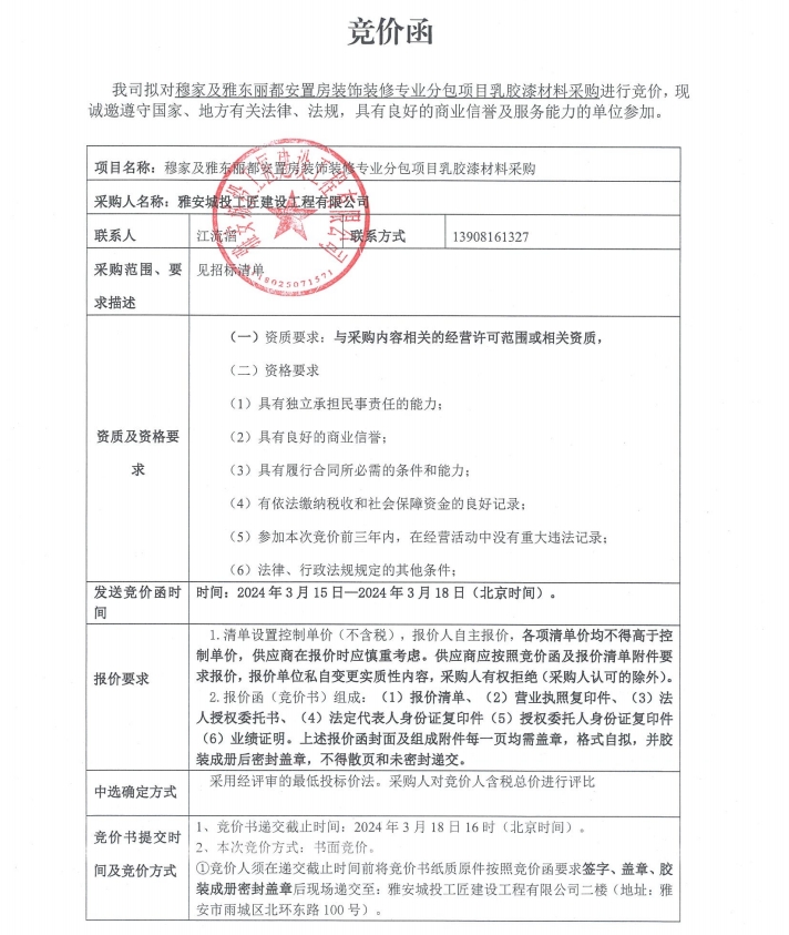 穆家及雅東麗都安置房裝飾裝修專業(yè)分包項目乳膠漆材料采購競價公告