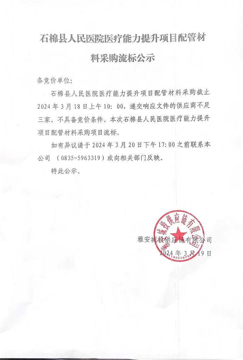 石棉縣人民醫(yī)院醫(yī)療能力提升項目配管材料采購流標公示