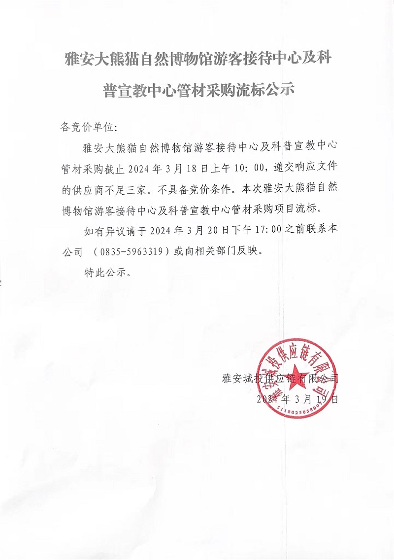 雅安大熊貓自然博物館游客接待中心及科普宣教中心管材采購流標(biāo)公示