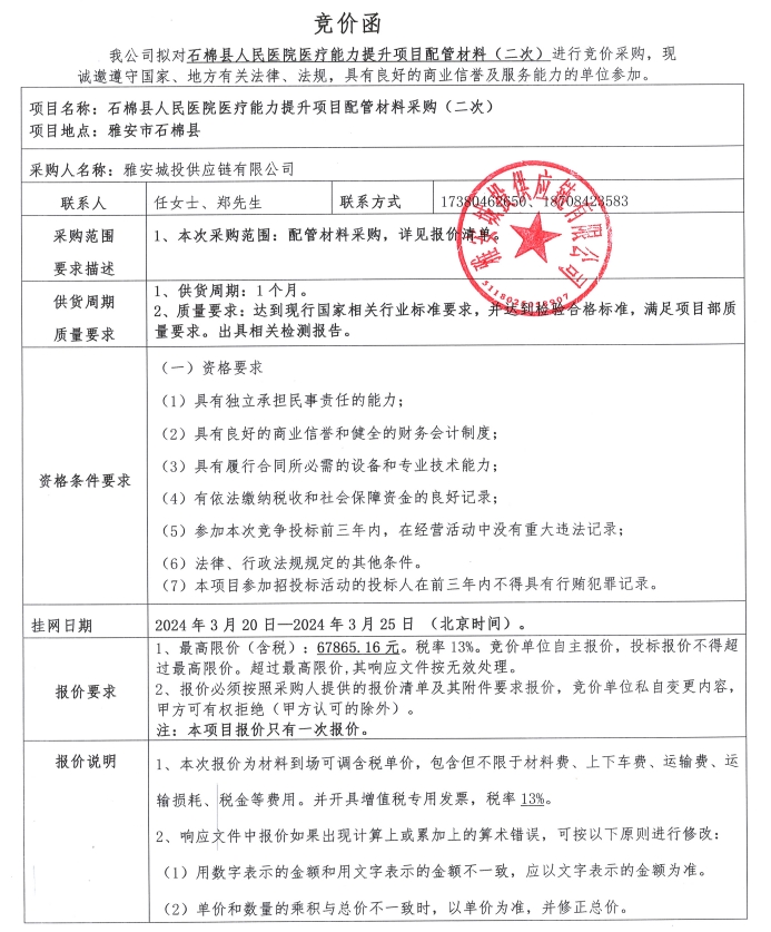 石棉縣人民醫(yī)院醫(yī)療能力提升項(xiàng)目配管材料(二次)競價(jià)公告