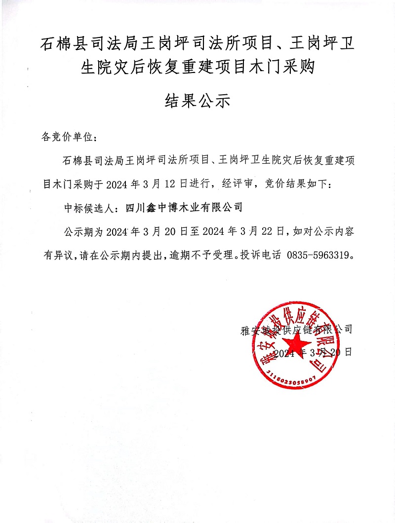 石棉縣司法局王崗坪司法所項(xiàng)目、王崗坪衛(wèi)生院災(zāi)后恢復(fù)重建項(xiàng)目木門采購結(jié)果公示