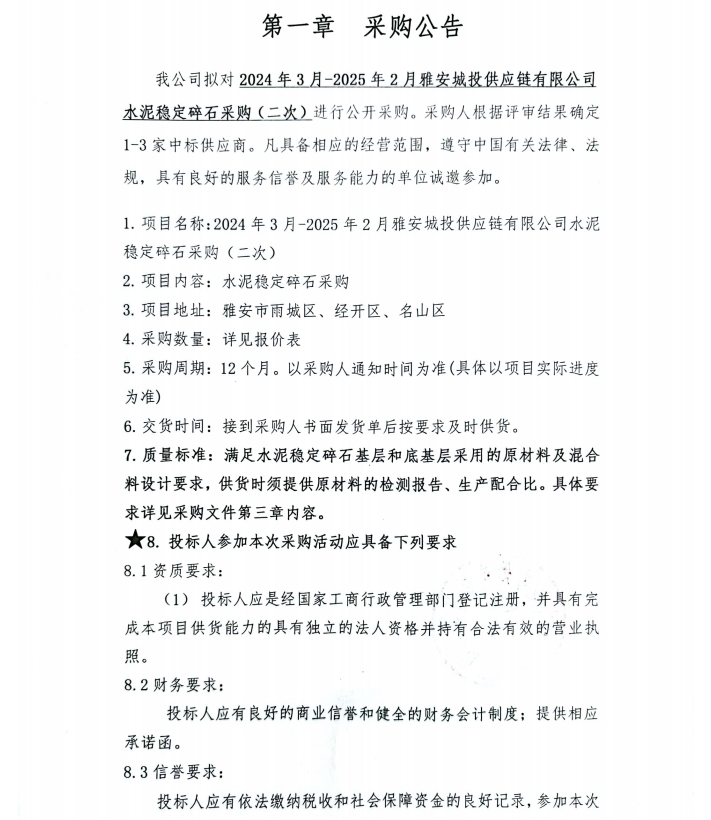 2024年3月-2025年2月雅安城投供應(yīng)鏈有限公司水泥穩(wěn)定碎石采購(gòu)(二次)公告