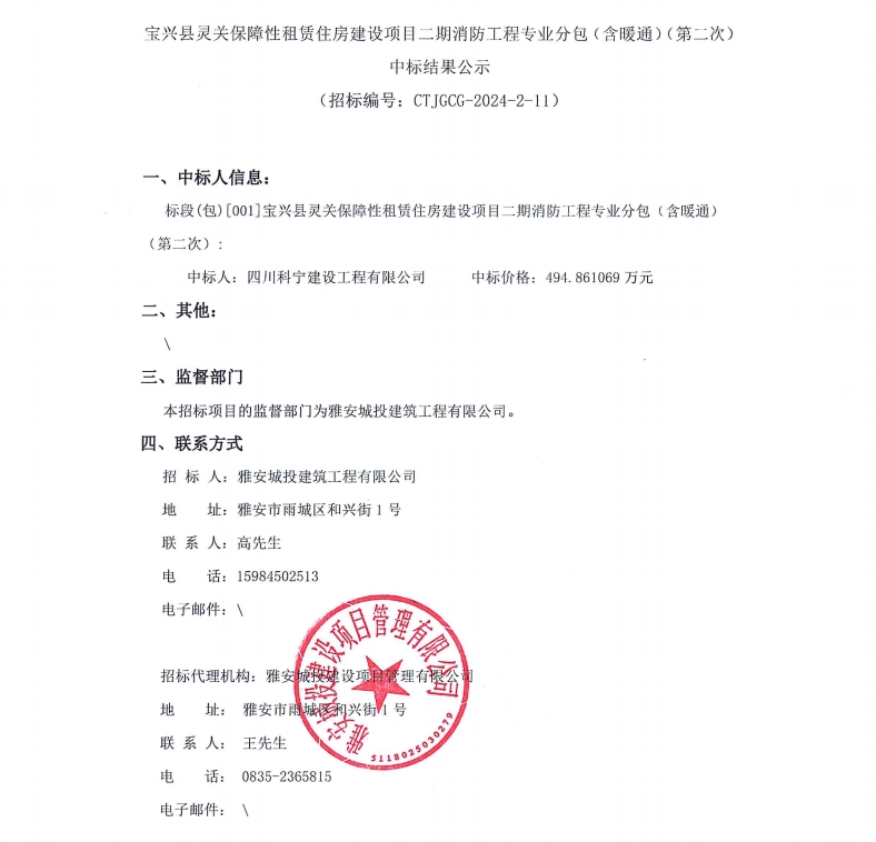 寶興縣靈關(guān)保障性租賃住房建設(shè)項(xiàng)目二期消防工程專(zhuān)業(yè)分包(含暖通)(第二次)中標(biāo)結(jié)果公示
