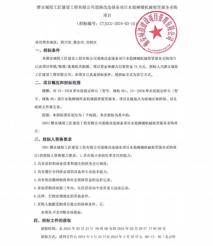 雅安城投工匠建設(shè)工程有限公司道路改造儲(chǔ)備項(xiàng)目水穩(wěn)攤鋪機(jī)械租賃服務(wù)采購(gòu)項(xiàng)目公告