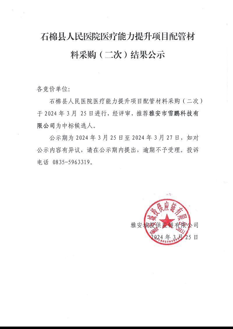 石棉縣人民醫(yī)院醫(yī)療能力提升項目配管材料采購(二次)結(jié)果公示