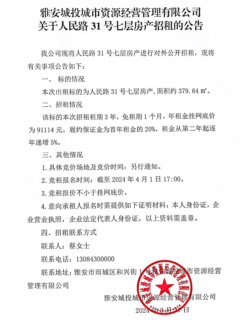 雅安城投城市資源經營管理有限公司關于人民路31號七層房產招租的公告