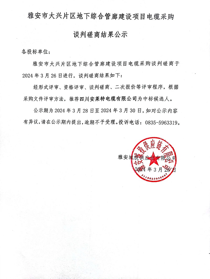 雅安市大興片區(qū)地下綜合管廊建設(shè)項目電纜采購談判磋商結(jié)果公示