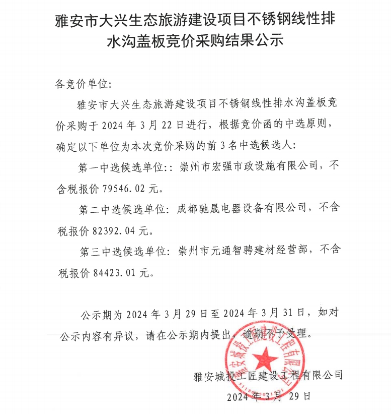 雅安市大興生態(tài)旅游建設項目不銹鋼線性排水溝蓋板競價采購結果公示