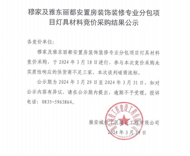 穆家及雅東麗都安置房裝飾裝修專業(yè)分包項目燈具材料采購競價結果公示
