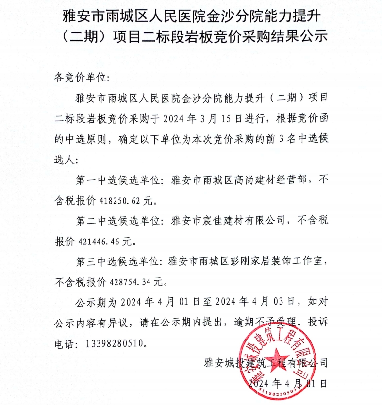 雅安市雨城區(qū)人民醫(yī)院金沙分院能力提升(二期)項目二標段巖板競價采購結(jié)果公示