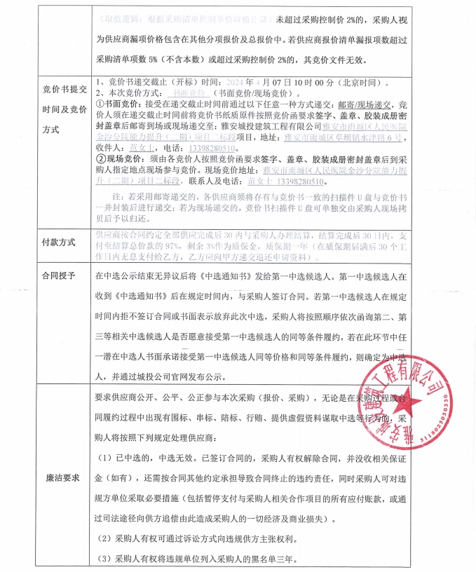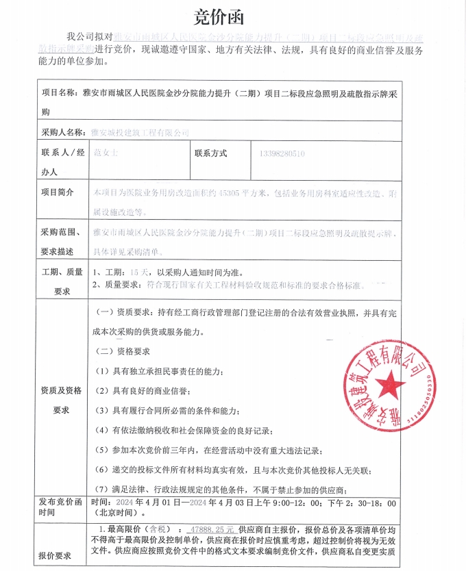 雅安市雨城區(qū)人民醫(yī)院金沙分院能力提升(二期)項目二標段應急照明及疏散指示牌采購競價公告
