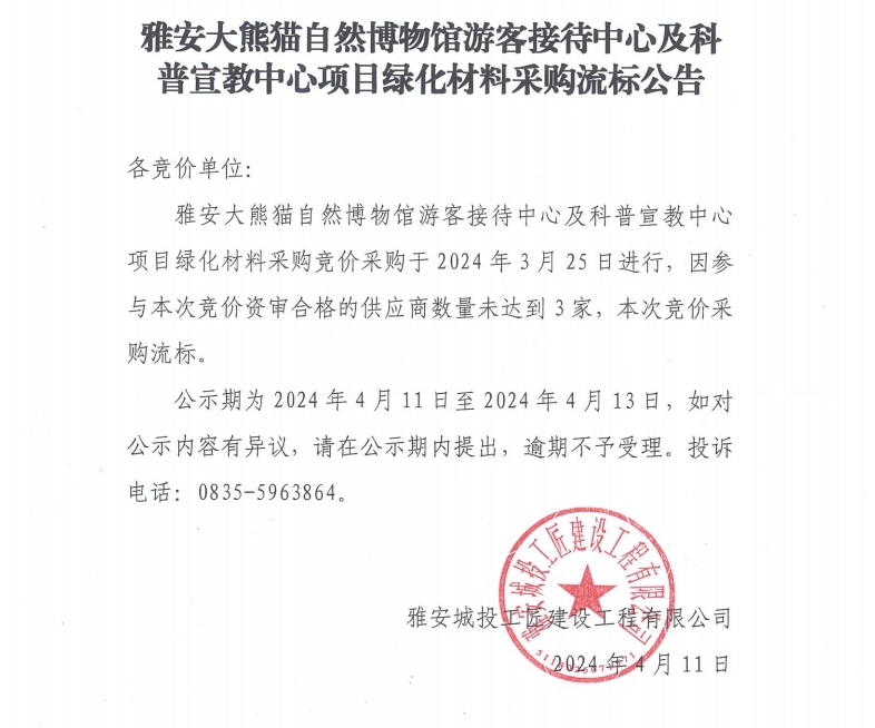 雅安大熊貓自然博物館游客接待中心及科普宣教中心項目綠化材料采購流標公告