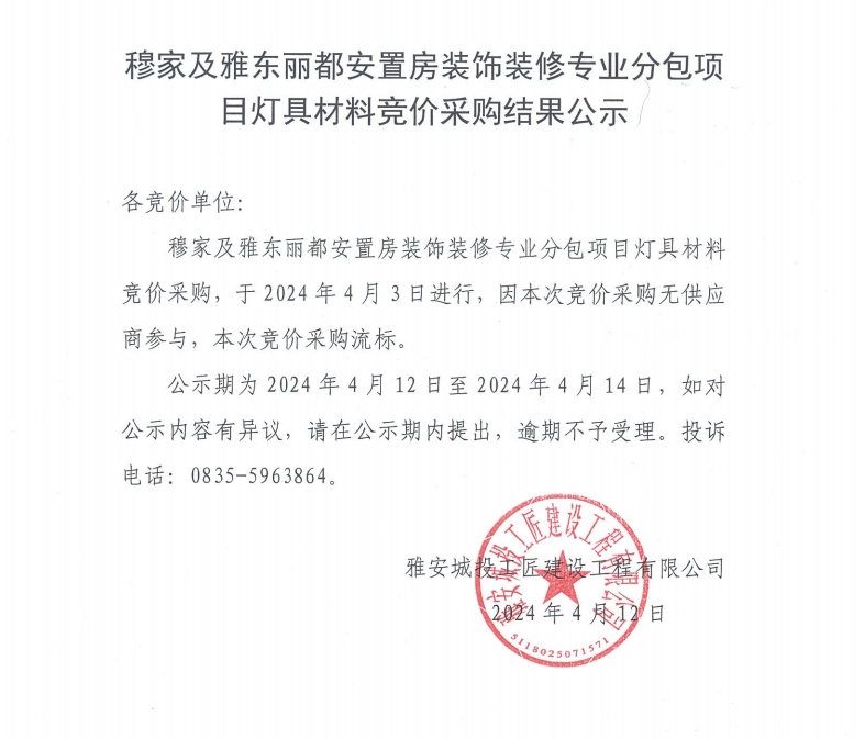 穆家及雅東麗都安置房裝飾裝修專業(yè)分包項目燈具材料競價采購結果公示