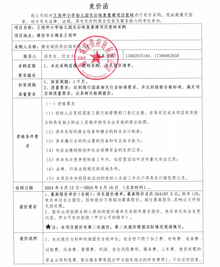 王崗坪小學(xué)幼兒園災(zāi)后恢復(fù)重建項(xiàng)目瓷磚競(jìng)價(jià)公告