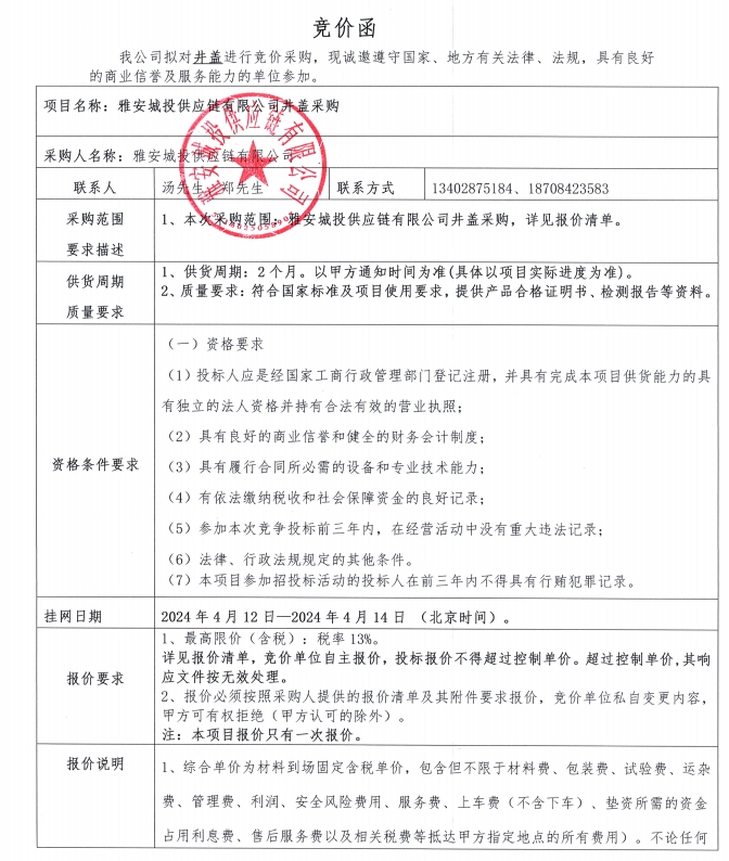 雅安城投供應(yīng)鏈有限公司井蓋采購競價公告