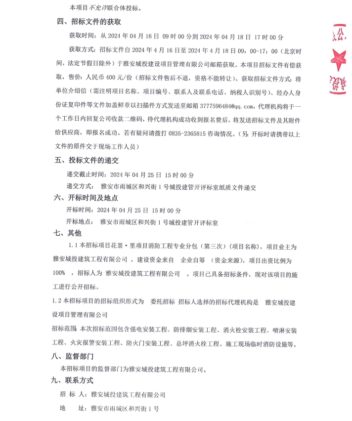 花襄·里項(xiàng)目消防工程專業(yè)分包(第三次)公告