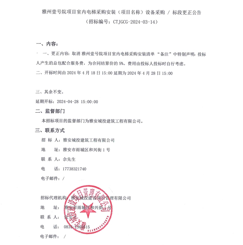 雅州壹號(hào)院項(xiàng)目室內(nèi)電梯采購(gòu)安裝(項(xiàng)目名稱)設(shè)備采購(gòu)/標(biāo)段更正公告