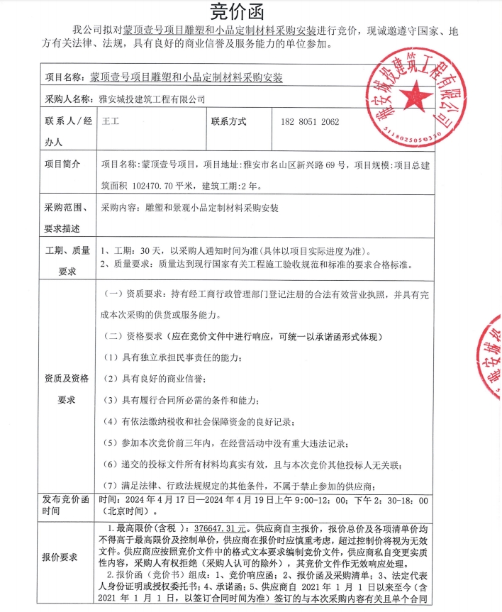 蒙頂壹號(hào)項(xiàng)目雕塑和小品定制材料采購(gòu)安裝競(jìng)價(jià)公告