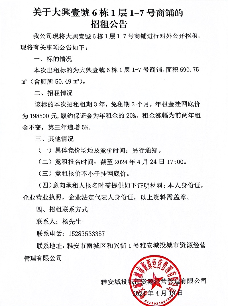 關(guān)于大興壹號(hào)6棟1層1-7號(hào)商鋪的招租公告