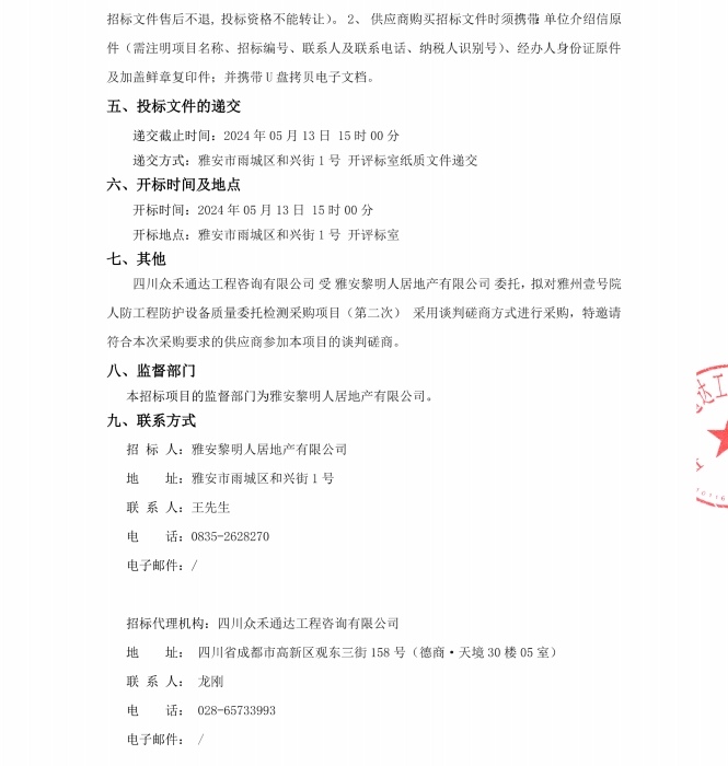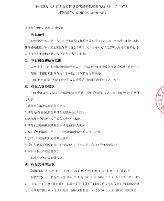 雅州壹號院人防工程防護設備質量委托檢測采購項目(第二次)公告