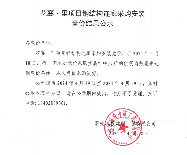 花襄·里項目鋼結(jié)構(gòu)連廊采購安裝競價結(jié)果公示