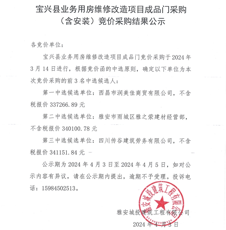 寶興縣業(yè)務(wù)用房維修改造項(xiàng)目成品門采購(含安裝)競價(jià)采購結(jié)果公示