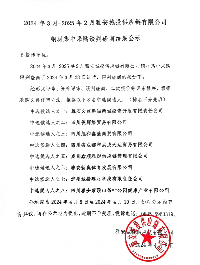 2024年3月-2025年2月雅安城投供應(yīng)鏈有限公司鋼材集中采購(gòu)談判磋商結(jié)果公示