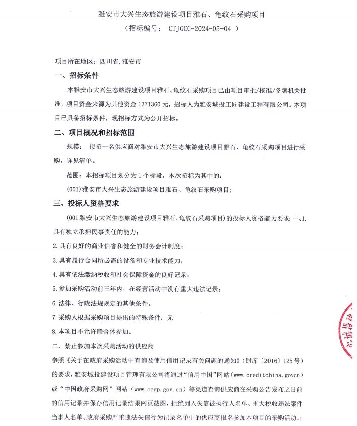 雅安市大興生態(tài)旅游建設項目雅石、龜紋石采購項目公告