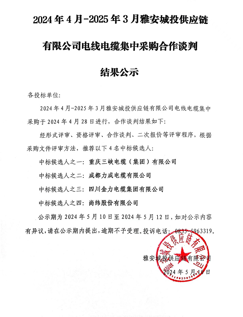 2024年4月-2025年3月雅安城投供應(yīng)鏈有限公司電線電纜集中采購(gòu)合作談判結(jié)果公示