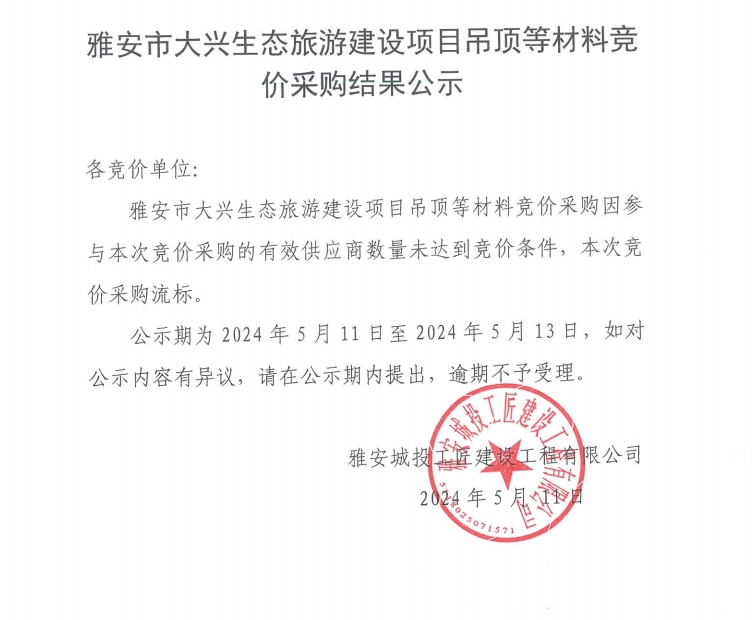 雅安市大興生態(tài)旅游建設(shè)項(xiàng)目吊頂?shù)炔牧细們r采購結(jié)果公示